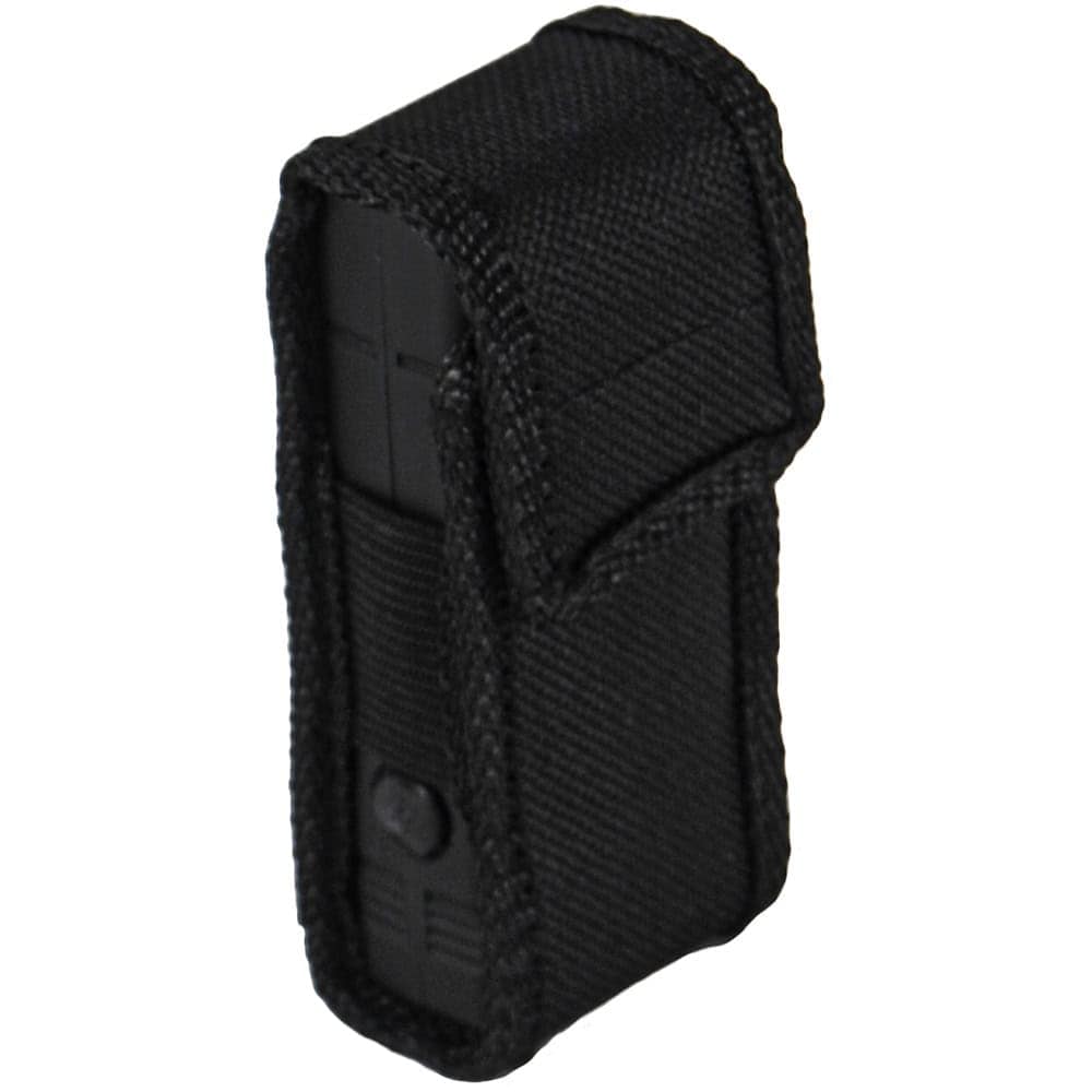 The Lil Guy measures 3.75 x 1.5 x 0.75 inches and weighs 0.35 lbs. Built from ABS plastic with rubberized coating. Powered by a rechargeable Ni-CD battery with built-in AC wall prongs — no charging cord needed. Comes with a nylon holster. Available in black. Backed by a lifetime warranty from Safety Technology.